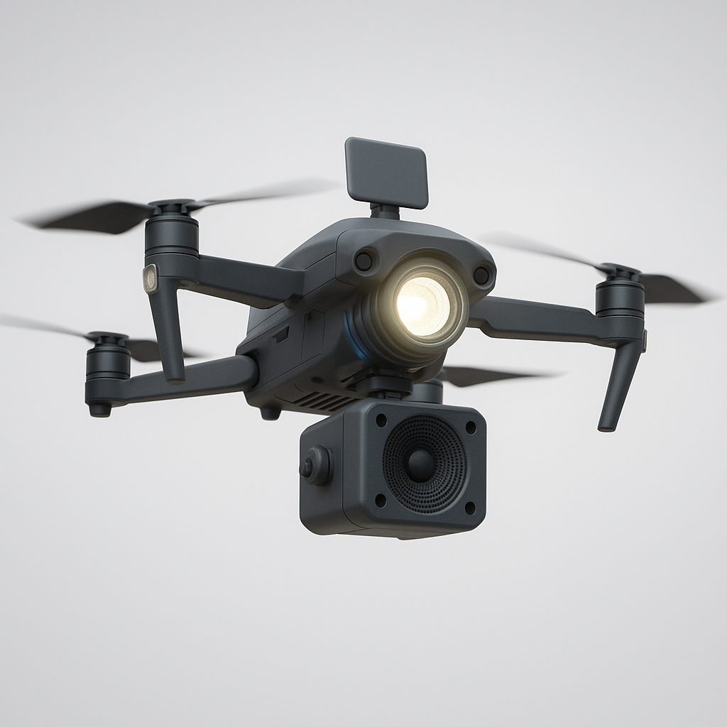 Combining WiFi-based sensing with optical (strobe/laser) and acoustic systems into a single drone payload poses technical integration, weight, and power management challenges. The degree to which light and acoustic effects reliably disorient or deter individuals may vary across environments, psychological states, or countermeasures. The system must operate reliably in GPS-denied or cluttered environments, requiring robust autonomous navigation and threat localization.